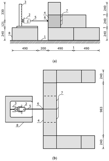 Test stand for measuring the efficiency of block suppression: (a) view; (b) top view. 1—floor, 2—K2007E01 force exciter, 3—measuring stand, 4—concrete hollow block, 5—M6 rod fixing the force sensor, 6—2311-1 force sensor and P1 accelerometer, 7—accelerometers marked in the test with numbers from P2 to P6, and 8—brick pedestal. Dimensions are in mm.