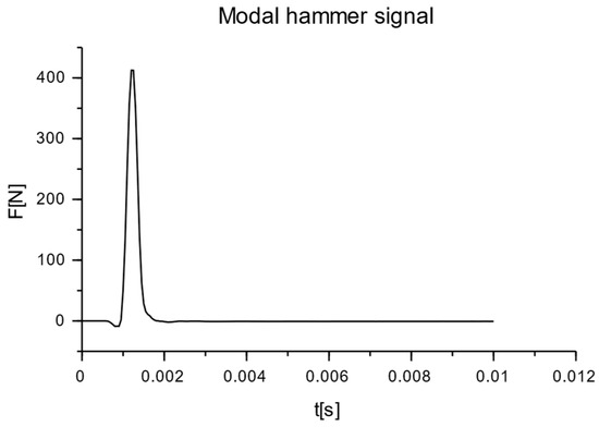 The nature and distribution of the excitation force pulse F over time, when hitting a concrete wall block with a PCB 086C03 modal hammer, is shown in Figure 11. A dedicated plate was selected for the modal hammer, with the goal of obtaining a signal that allowed for the determination of a clear pulse distribution profile. The impact with the modal hammer was repeated until the maximum pulse force F was obtained, ranging from 400 to 415 N. Three trials were thus determined for each series of blocks, in which the discrepancy in the signals was less than 1%. Acceleration values were read from the six accelerometers numbered from P1 to P6, arranged according to the diagram shown in Figure 8. The results were read using the Sirius DEWESoft’X3 program (manufactured: Dewesoft, Trbovlje, Slovenia).