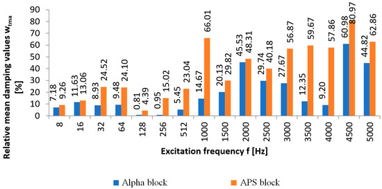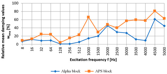Based on the arithmetic mean, the relative mean damping values were calculated at points P2 to P6. For the selected sixteen considered frequencies, the damping values for the Alpha and APS blocks were calculated. A comparison based on the arithmetic mean of the values obtained for the measurement points P2 to P6 for the relative mean damping values in the excitation frequency range of 8 ÷ 5000 Hz for the Alpha and APS blocks is shown in Figure 12.