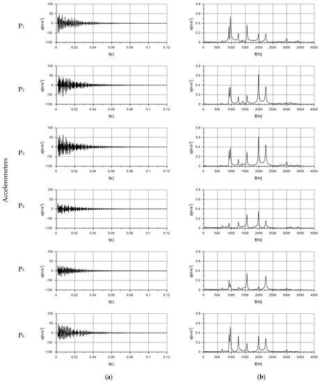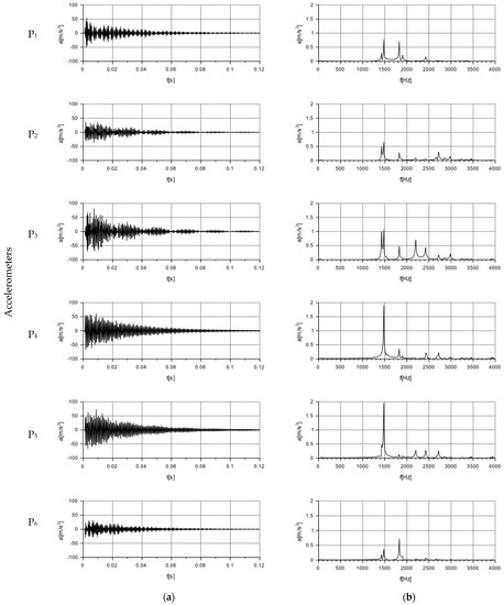Graphs of free vibrations for the Alpha block as a result of the impact with a modal hammer with a force of 412 N for accelerometers set at the measurement points, according to the diagram in Figure 8 and Figure 16. Acceleration value: (a) in the time domain; (b) in the frequency domain (spectrum).