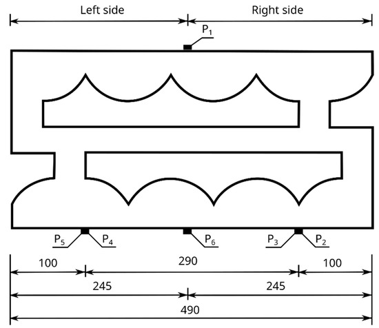 Scheme of arrangement of accelerometers on the walls of the tested hollow concrete wall blocks: (a) front wall with the location of the P1 accelerometer and the K2007E01 electromagnetic force exciter, (b) rear wall with the location of accelerometers P2 to P6. Dimensions are in mm.