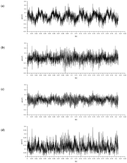 The measurement of vibrations allows for the observation of complex, non-sinusoidal waveforms, which, after a frequency analysis, can be presented in the form of an amplitude spectrum. For a quantitative description of these vibrations, peak-to-peak values are taken, from which it is possible to determine the maximum value qimax of the difference in the positive deviation qi(+) and negative deviation qi(-) of the signal at the measurement points P1 to P6, according to Figure 8—Equation (1).