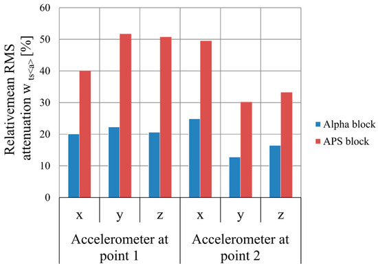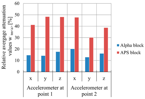 Based on Equation (4), the relative mean RMS damping in the excitation frequency range of 8 ÷ 5000 Hz for the Alpha and APS hollow blocks was calculated for the arithmetic mean of the measurements at points P2 to P6 located on the back wall of the tested hollow blocks. The results are shown in Figure 13.