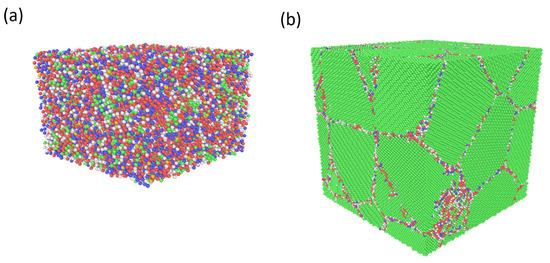 Three sets of geometries were generated to investigate the thermal expansion by means of CMD: (i) fully amorphous configurations, (ii) single-crystals and (iii) nanosized polycrystals. To produce fully amorphous structures, we used a multi-step procedure that was initiated by the generation of a randomized structure containing ∼22,000 atoms. It was first heated up to and equilibrated at K and zero pressure tensor within the isobaric-isothermal (NPT) ensemble using a Nosé-Hoover thermostat and fully anisotropic barostat [43,44,45,46]. Following this melting procedure, which lasted for 0.75 ns (using a timestep of 0.25 fs), the system was quenched and equilibrated at room temperature such that a non-crystalline structure was obtained; see Figure 1a. The high temperature used in the first step of the process was adopted to create a highly disordered template with particles of high kinetic energy, from which realistic amorphous structures could be obtained during the subsequent cooling process. Periodic atomistic nanocrystals with different grain sizes were generated using the ARL-COMBAT toolkit [47,48], which relies on Voronoi tesselation to produce the polycrystalline geometries. Four different specimens, each containing 13 or 14 grains, with the averaged grain size diameter corresponding to and 25.7 nm, respectively, were generated, see Figure 1b.