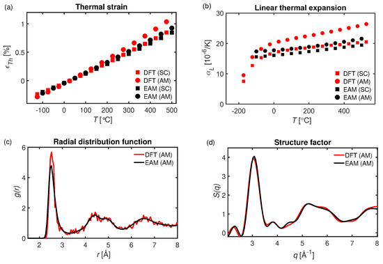 (a) Thermally-induced strain for a fully amorphous (AM) configuration and single-crystal (SC) Cu as computed by means of CMD and DFT. Here the reference state corresponds to that at room temperature. (b) Temperature dependent CTE for AM and SC. (c) Radial distribution function and (d) structure factor for AM Cu.