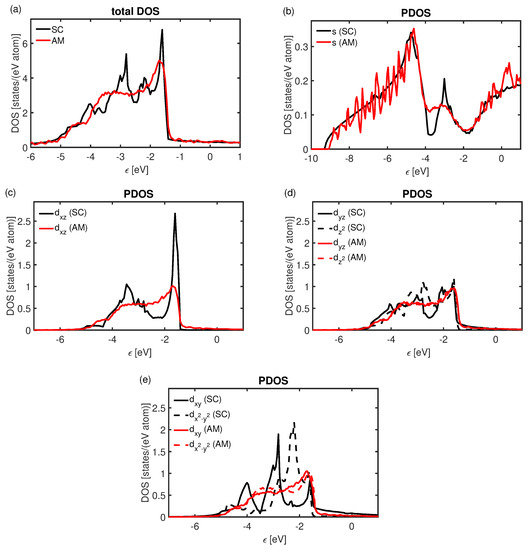 (a) Total DOS and (b–e) projected DOS for single-crystalline and amorphous Cu. The Fermi level is chosen as reference.