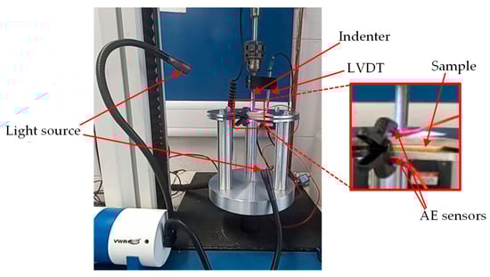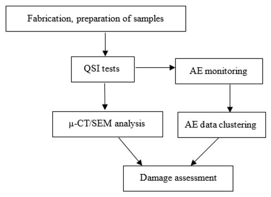 A schematic of the experimental setup used in this study is presented in Figure 1. As stated, two different sample types, GL and GS, were tested and subjected to QSI with three different indenter shapes, monitored with AE to capture visible and invisible damage in the specimens. The average data were obtained and damage assessment was conducted with a clustering algorithm, as well as μ-CT/SEM investigations.