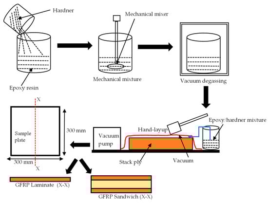 Aerospace-grade E-glass plain weave fabric with 160 g/m2 from Samson Composites Ltd. (Shenzhen, China) was used as reinforcement and face sheets for the FRPSS, while epoxy resin with C-1 catalyst hardener from EPOCHEM Ltd. (Lagos, Nigeria) with a volumetric ratio of 2:1 was employed as the matrix system to fabricate samples at room temperature (27 °C in Nigeria) with a curing time of 18 h. For the core, EASYCell 75 closed-cell PVC foam core forms from EASY composites (Stoke-on-Trent, UK) were used [26]. Details of the constituents’ parameters are given in Table 1. A hand lay-up and a vacuum-bagging technique, as described in Figure 2, were deployed to produce plates of 300 mm × 300 mm with a configuration of 8 layers of E-glass fabric for the GL samples and 4 layers/PVC foam/4 layers for the GS specimen. In order to reduce the presence of air bubbles in the mixture of the hardener and resin, it was necessary to degas the mixture for about 2 min before applying it to the sample and subsequent vacuum bagging. This mode of fabrication was selected due to its low cost, simplicity, and wide range of applicability.