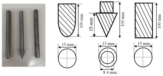 QSI was performed on the samples with different indenter shapes to study the damage tolerance of the materials, to provide useful data on the sequence of damage, with a minimum of 5 samples per configuration. The experiment was carried out in line with the ASTM D6264/D6264M-17 standard test method with a displacement control of 1 mm/min, while the vertical displacement was measured using a linear variable differential transformer (LVDT) [30]. The test was performed using an Instron 3369 Universal machine 50 kN cell (Instron Corporation, Norwood, MA, USA) with a fixture made from steel plates. Three different indenter types made from stainless steel were used for this experiment: hemispherical, conical, and flat indenters with a diameter/length of 13 mm. During the test, the indenter was aligned to the centre of the specimen with an offset at no more than 0.01 mm, and then indented until complete perforation. The experimental jig setup is depicted in Figure 3, while the indenter geometry is shown in Figure 4.