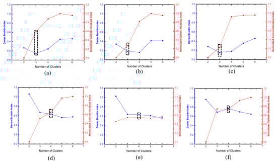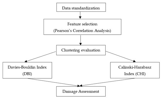 Two cluster validity indices, the Calinski–Harabasz index (CHI) and the Davies–Bouldin index (DBI), were adopted to estimate the number of clusters for damage assessment. These indices were combined in previous studies in estimating the optimal number of clusters for damage assessment in AE [14,35,37]. CHI gives a ratio of the degree of separation between clusters to the degree of inter-cluster dispersion, with higher CHI scores suggesting better results of well-separated and tightly packed clusters. Mathematically, CHI is defined as:
