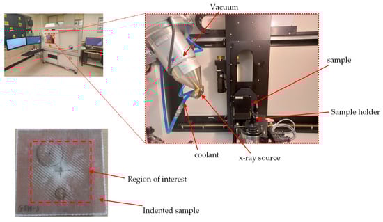 The samples were scanned using a high-resolution X-ray μ-CT system NIKON XTH X-Tex 160Xi, (NIKON Metrology Europe, Leuven, Belgium) with an effective pixel size of 27.79 μm. The beam energy, beam current, and power settings were 65 kV, 65 A, and 4.2 W, respectively, with an exposure time of 500 ms. A total of 3016 tiff images were created per sample scan, with the region of interest limited to the areas surrounding the damaged portion of the samples, as can be seen in the experimental setup in Figure 7. The acquired microscopy data were first processed with VG Studio Max 3.1 software (Volume Graphics, Charlotte, NC, USA) and then post-processed using commercial software (Dragonfly ORS, Adelaide, South Australia, Australia). The optimum centre of rotation was determined in the initial post-processing phase, with all generated slices combined to develop the volumetric image in the reconstruction phase. Gaussian filters were used to reduce the characterisation noise generated by the volumetric imaging, which led to a minimal data loss from the sample materials’ homogeneity. The generated tiff files were incorporated into the Dragonfly software with voxel analysis to determine damage parameters.