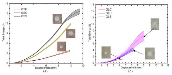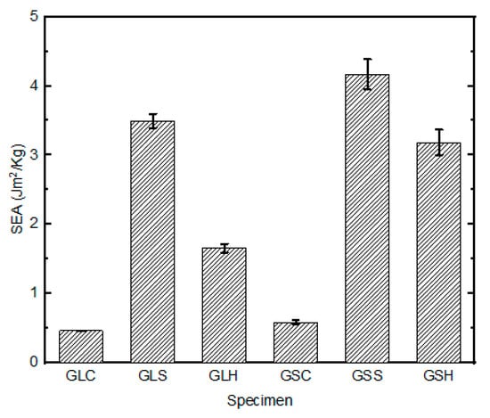 A comparison of the energy-absorption capabilities per unit thickness of the GS and GL samples revealed that the former (GSS and GSH) had the highest potential for energy- absorption, while the samples indented by the conical indenter (GSc and GLc) had lower energy-absorption properties. The SEA of the GL and GS samples impacted with the square and hemispherical indenters differed significantly, by 19.2% and 43.3%, respectively (Figure 10). This is attributed to the presence of the core and the related increase in the sample thickness. However, for the samples tested under conical indentation, the energy-absorption curves showed an insignificant difference (3.5%) between the GS and GL samples. This was solely caused by the shape of the indenter, and thus limited the contributory effects of the core and through-thickness on the energy-absorption properties of the samples under such regimes.