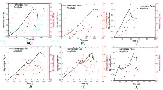 Average force-time curve with AE amplitude: (a) GLH, (b) GLS, (c) GLC, (d) GSH, (e) GSS, (f) GSC.
