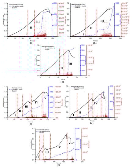 Normalised force-time curves with AE cumulative counts and duration: (a) GLH, (b) GLS, (c) GLC, (d) GSH, (e) GSS, (f) GSC.