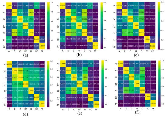 PCC between AE signals for different specimens: (a) GLH, (b) GLC, (c) GLS, (d) GSH, (e) GSC, (f) GSS (PF—peak frequency, A—amplitude, D—duration, C—counts, RT—rise time, E—energy, and FC—frequency centroid).