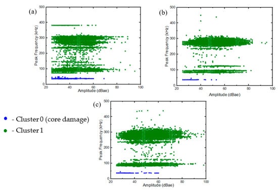 The two-stage clusterisation approach proposed in [39] was adopted to determine the damage morphology of the samples. The first stage for the GS specimen was conducted with AE features divided into two broad classes. As discussed earlier, the damage mechanism in the GL samples was similar to that of the face sheets of the GS specimens and, thus, the additional cluster could be attributed to the damage in the core of the GS specimen via direct elimination method. This was also corroborated by the similarities in the AE events described in Figure 11 and Figure 12. In Figure 15, cluster 0 represents the low-frequency features (<60 kHz), with a variation in amplitude (up to 60 dBae) indicative of a damage phenomenon, while cluster 1 represents features with frequencies above 75 kHz and up to 85 dBae. The frequency range for core damage can be delineated according to the previous literature [39,41].