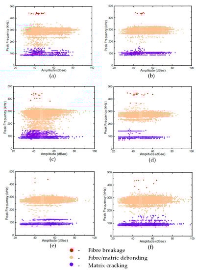Stage 2 of the clusterisation involved the processing of all the remaining AE features in the GS and GL samples. Three distinct clusters were observed (see Figure 16), and the corresponding damage sequence was attributed to the laminates and face sheets of the GS samples. The results revealed that the frequency content attributed to matrix cracking was recorded within the range of 60–140 kHz, with most hits in the range between 90 and 110 kHz, similar to the results reported in [16,28]. This range could be observed both in GL and GS samples. Similarly, further phenomenological damage, such as fibre/matrix debonding and fibre breakage, was also obtained from the analysis. Two higher frequency damage modes identified in the tested specimens were cluster hits at 180–315 kHz and 360–453 kHz, with a concentration of hits at 222–315 kHz and 453 kHz, corresponding to fibre/matrix debonding and fibre breakage, respectively.