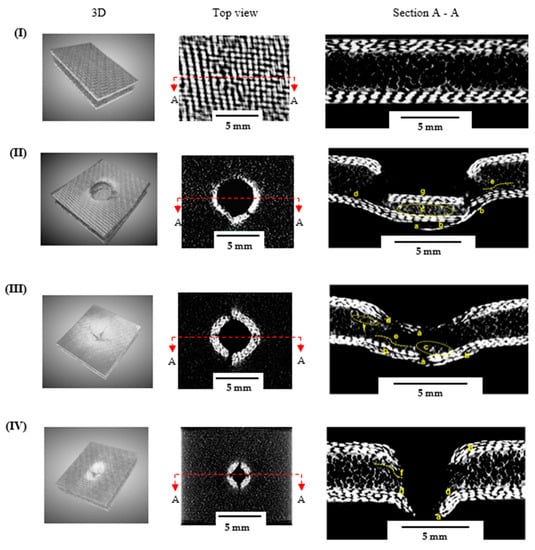 X-ray μ-CT analysis for GS samples: (I) undamaged (II) GSS, (III) GSH, (IV) GSC note; a—fibre breakage, b—delamination, c—core crushing, d—core/face sheet debonding, e—core fracture crack, f—core compression, g—compressed face sheets.
