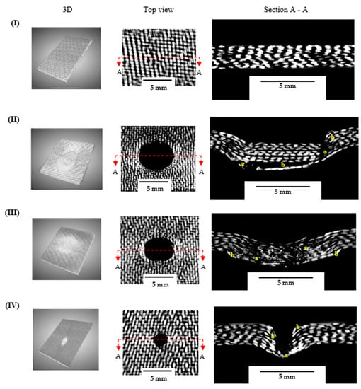 Post mortem μ-CT analysis for GL samples: (I) undamaged, (II) GLS, (III) GLH, (IV) GLC. Note: a—fibre breakage, b—delamination.