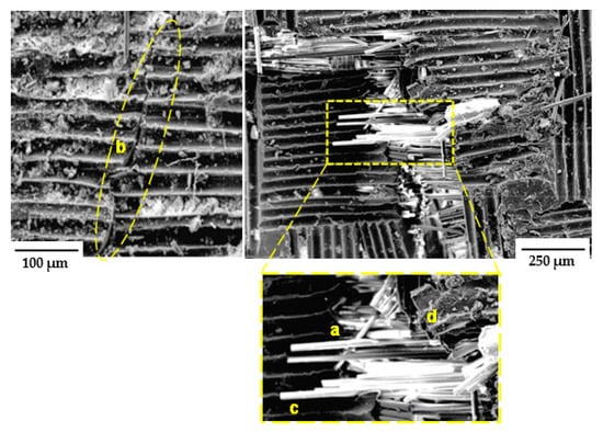 SEM analysis of GS face sheet and GL: a—fibre breakage, b—matrix crack, c—fibre pull-out, d—fibre/matrix interface debonding.