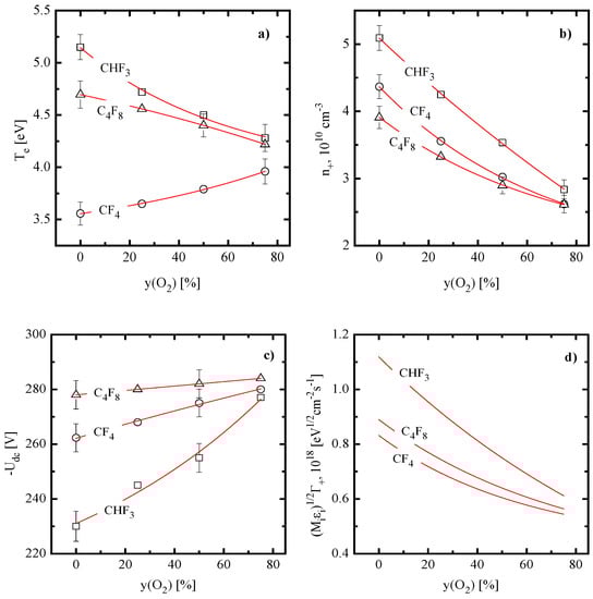 The basic properties of nonoxygenated CF4−, CHF3− and C4F8− plasmas have been studied, analyzed, and compared in our previous works [9,10,11,20]. As such, the discussion below will cover only the issues that seem to be important for understanding plasma chemistry and etching kinetics in the presence of oxygen. In addition, since it was impossible to perform the quantitative analysis for both electron energy loss channels and ionization/recombination balance (see our arguments in Section 2.2), the effect of O2 on both electron temperature and plasma density may be discussed only in a suggestive scale, with accounting for general regularities of plasma chemistry and model-predicted densities of neutral species. As such, plasma diagnostics data shown in Figure 1 may briefly be commented as follows: