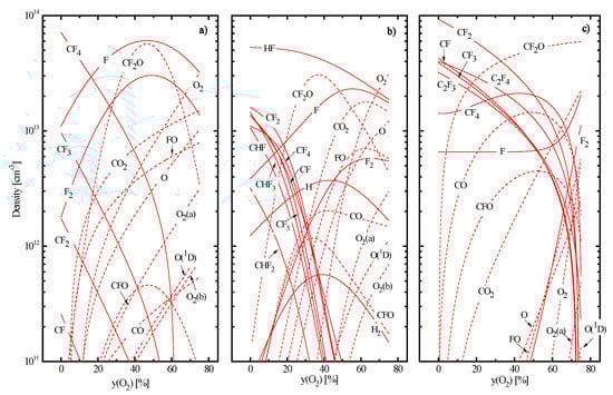 Figure 2. Model-predicted densities of neutral species vs. fraction of O2 in CF4 + O2 (a), CHF3 + O2 (b) and C4F8 + O2 (c) plasmas. Curves marked as O2 (a) and O2 (b) correspond to metastable states of O2(a1Δ) and O2(b1Σ), respectively. Dashed lines are to highlight oxygen-containing reaction products. Processing conditions are the same as those specified under Figure 1. - Plasma density (Figure 1b) exhibits decreasing tendencies vs. in all three gas systems. In the case of CF4 + O2 plasma, the evident reason is the 10-times lower rate coefficients for the ionization of F (~5.8 × 10−11 cm3/s at = 3 eV) and F2 (~1.5 × 10−11 cm3/s at = 3 eV) compared with CFx (~1.5 × 10−10 cm3/s for x = 4 and ~5.0 × 10−10 cm3/s for x = 3 at = 4 eV). Therefore, one can easily imagine that an increases in suppresses the total ionization frequency (and thus production rates for electrons and positive ions) despite weakly increasing . Similar situations for CHF3 + O2 and C4F8 + O2 plasmas probably result from decreasing ionization rate coefficients for all neutral species. The indirect proof is the deeper fall of in the CHF3 + O2 plasma, where the stronger decrease in takes place. An additional reason may relate to increasing densities of more electronegative oxygen-containing species that accelerates losses of positive ions and electrons through ion–ion recombination and dissociative attachment, respectively.