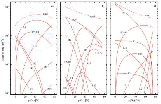 In pure CF4 plasma, dominant gas-phase components are original CF4 molecules, CF3 radicals, and fluorine atoms with the condition of > ≈ [9,10,11] (Figure 2a). Accordingly, reactions R1 for x = 3, 4 and R2 for x = 4 compose ~ 80% of the total F atom formation rate (Figure 3a). The loss of F atoms is mainly provided by heterogeneous recombination pathways, such as F + F → F2 and F + CFx → CFx+1 inside R22 and R23. The addition of O2 rapidly lowers densities of CFx radicals due to their conversion into CF2O, CFO, CO and CO2 species (Figure 2a) in R12 ( ~ 6.1 × 10−11 cm3/s for x = 1 and ~3.2 × 10−11 cm3/s for x = 2, 3). The domination of CF2O over oxygen-containing reaction products as well as the drastic growth of their density at < 40% is supported by gas-phase processes R13 ( ~ 1.1 × 10−11 cm3/s for x = 2 and ~ 7.0 × 10−13 cm3/s for x = 1), R14 ( ~ 1.0 × 10−11 cm3/s) and R15 ( ~ 8.0 × 10−11 cm3/s). The condition > 40% causes the more than ten-time decrease in as well as reduces rates of R12 and R13 due to the fluorocarbon-deficient reaction regime. Accordingly, this produces the maximum on the curve, as shown in Figure 2a. As for the kinetics of F atoms, there are two principal effects influencing their formation rate. First, an increase in accelerates the formation of F2 molecules through R16 ( ~ 2.0×10−11 cm3/s for x = 2) and R23 that sufficiently influences the rate of R4 (Figure 3a). As a result, the latter overlaps the total effect from R1 and R2 at > 10–15% O2 as well as exhibits the maximum at ~40% O2 following the change in . Second, the appearance of oxygen adds new F atom formation pathways, such as R7, R8, R12, and R16–R18. From Figure 3a, it can be understood that the superposition of R4, R7, and R8 produces the maximum on the total F atom formation rate (and thus on the F atom density, as shown in Figure 2a) while noticeable contributions of R16 and R17 appear only at > 60%. The faster growth of at 0–40% O2 is due to the simultaneously decreasing F atom losses in F + CFx → CFx+1 pathways inside R22 and R23.