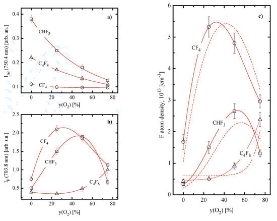 Emission intensities (Ar 750.4 nm (a) and F 703.8 nm (b)) as well as F atom densities obtained using the actinometry procedure (c) vs. fraction of O2 in CF4 + O2, CHF3 + O2 and C4F8 + O2 plasmas. Solid lines in sectons (a–c) are fittings of experimental data to guide the eye only. Dashed lines in Figure (c) repeat model-predicted F atom densities from Figure 2. Processing conditions are the same with those specified under Figure 1.