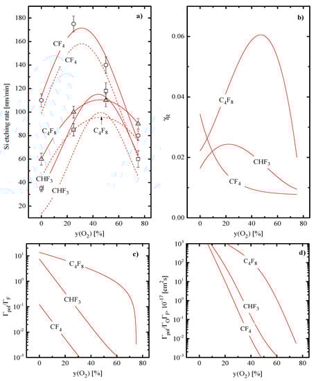 From Figure 5a, it can be seen that the Si etching rates in CF4 + O2, CHF3 + O2 and C4F8 + O2 plasmas are characterized by different absolute values but exhibit similar nonmonotonic changes with increasing vs. . The evaluation of using experimental data on Si sputtering yields ( ≈ 0.18–0.29 atom/ion at ion energies of 200–300 eV [41,45]) indicates that the condition << , where is the measured Si etching rate, always takes place. The latter means that (a) the dominant etching mechanism in all three cases is the heterogeneous chemical reaction R49: Si(s.) + xF → SiFx(s.) → SiFx (where (s.) relate to the surface-bonded state), characterized by the rate of ; (b) the nonmonotonic curves are completely related to identical behaviors of ; and (c) the shape of curves in C4F8 + O2 plasma contradicts with the monotonic change in the F atom flux that directly points out on the nonconstant effective reaction probability . In reality, it was found that all three reaction probabilities are sensitive to the O2 fraction in a feed gas even at the nearly constant surface temperature (Figure 5b).