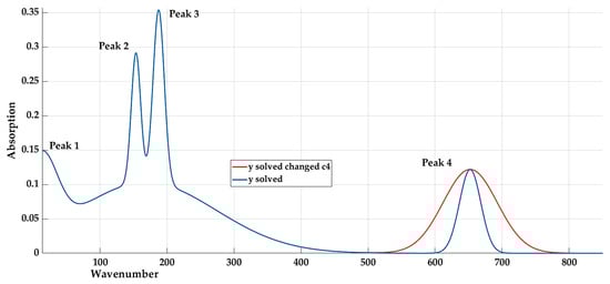The first step is to select the function that will form the basis for the search function, using the curve fitting tool in Matlab. The modified data were imported into the basic Matlab environment, and the relevant variables were prepared for the use of the toolbox. The x-coordinate is “Wavenumber”, and the y-coordinate is the obtained measured absorption data []. By successively searching for the best model, the “Gaussian” option was selected. Based on the graphical interpretation of the measured data, we recorded 5 significant peaks. This assumption was subsequently used when setting the parameters of the selected “Gaussian” type in the curve fitting toolbox environment in the Matlab application. When using the specified type, the obtained values of the coefficient of determination are listed in Table 2. This function was subsequently used for all material variants, and the value of the quality coefficient R2, RMSE, and SSE was compared. Table 2 shows the specified values.