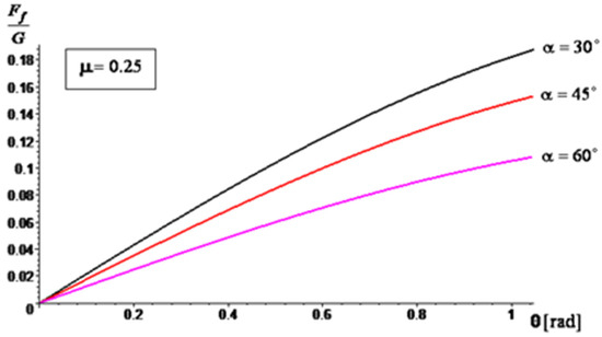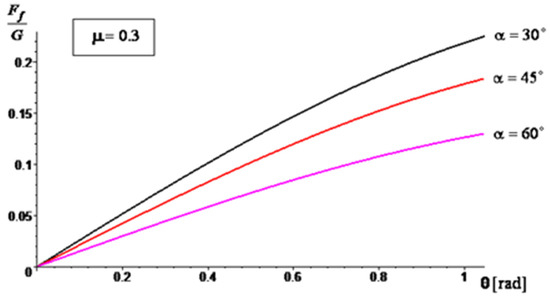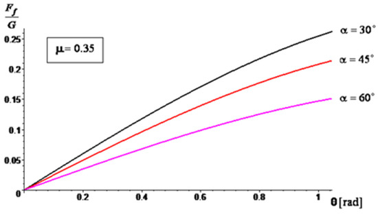 - The analytical calculation regarding the influence of the inclination angle and the sliding frictional coefficient between the aggregate material and the blade—on the ratio between the frictional force (manifested on the surface of the mixing blade) and the weight of the aggregate material that loads the blade during operation—suggests that modifying the inclination angle can have a significant impact on the frictional forces experienced by the mixing blade during mixing;