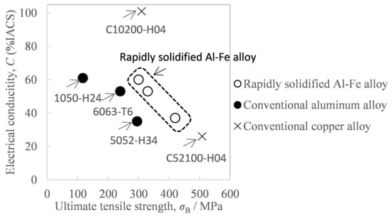Comparison of the tensile strength and electrical conductivity of aluminum alloys and copper alloys. The property of the rapidly solidified Al-Fe alloy was cited from Reference [].