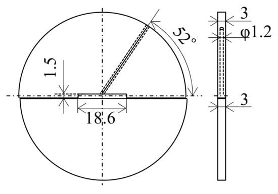 The sample preparation method is shown in Figure 2. An air-jet atomized Al-2.3%Fe alloy powder manufactured by Toyo Aluminium K.K. was used as the raw material. The impurities in the alloy are 0.1% or below. The average particle size of the powder is approximately 30 μm. This Al-2.3%Fe alloy powder was spark plasma sintered into a cylindrical body 42 mm in diameter and 23 mm in height under the conditions of a temperature of 623 K and the pressurization of 20 MPa. Four pieces of this sintered body were hot compressed axially in a die with a 42 mm internal diameter at a temperature of 633 K and a load of 1400 kN. This compressed billet was preheated again and then hot extruded into a plate material using a 200-ton horizontal hydraulic press with a container with a 42 mm internal diameter (YKK Corporation). Assuming that the properties of the extrudate would be affected by the phase change from an Al6Fe phase to an Al13Fe4 phase at 623–673 K or above [], the billet preheating temperature before extrusion was set up in two ways, 663 K and 673 K. The die preheating temperature was set to 773 K, which is higher than the billet preheating temperature because the extruder does not have a function to heat dies. The extrusion die was designed as in Figure 3. We made a hole just above the 18.6 mm-wide bearing surface and inserted a thermocouple into the hole to measure the temperature changes in the die during extrusion (hereinafter referred to as the “in situ die temperature”). The extrusion loads were converted from the hydraulic drive force of the ram. To prevent the material from clogging the extruder, the first 500 mm of the material was extruded at a slow ram speed of 0.5 mm/s, and then, a total approximate length of 2500 mm of the material was extruded at a fast ram speed of 6 mm/s to simulate a steady extrusion. The time taken for the latter steadily extruded portion was about 7 s. Test samples were taken from the 500 mm, 1500 mm, and 2500 mm positions from the front end of the extrudates. In the present paper, these positions are called the “front end,” “center,” and “rear end,” respectively. The relative density of the extrudates (relative to the density of casts) measured by Archimedes’ method was 0.99 or more in all extrusion conditions, which confirmed that the extrudates were completely densified. To understand the effect of the temperature of additional heat treatment on the extrudates, the extrusion samples were annealed in an atmospheric furnace set at 698 K or 713 K for 15 min (soaking for 5 min) and then quenched in water.