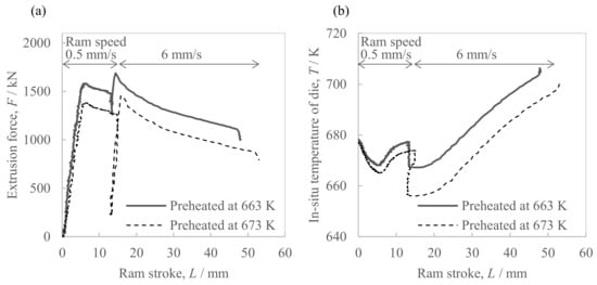 Parameters of the hot extrusion of Al-2.3%Fe alloy billets preheated at 663 K and 673 K\; (a) extrusion force and (b) in situ temperature of the extrusion die.