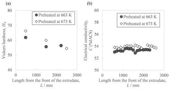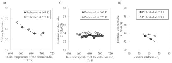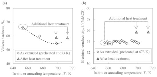 Relationship between the in situ temperature of the extrusion die or additional heat treatment temperature and (a) hardness and (b) electrical conductivity of the extrudate, which was preheated at 673 K before extrusion. The dotted line in (a) is the trend line found in Figure 7a.