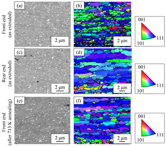 Microstructures of the Al-2.3%Fe alloy extrudates which were preheated at 673 K before extrusion: (a,c,e) SEM-compo images and (b,d,f) EBSD-IPF images. Note that the observed areas of the SEM-compo images and EBSD images are different.