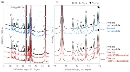 Of the extrudates with billet preheating temperatures of 663 K and 673 K, Figure 9 shows the microstructures of both the front end and rear end in the case of a preheating temperature of 673 K, which showed a greater fluctuation in hardness in Figure 6a. While the second-phase particles at the front end in Figure 9a were spherical, the rear end in Figure 9c exhibited somewhat coarse needle-like particles in addition to spherical ones. From the EBSD-IPF images in Figure 9b,d, we found the area weighted average of the grain size. The grain size of the front end was 1.2 μm and that of the rear end was 3.8 μm, indicating that the grain size of the rear end was coarser than that of the front end. Figure 9e shows the microstructural photo of the front end after annealing at 713 K, which indicates the amount of needle-like particles increased compared to Figure 9a. The grain size of the front end in Figure 9f was 2.2 μm. Figure 10 shows the results of the synchrotron light XRD analysis. As another second phase of the aluminum matrix, a peak corresponding to the metastable Al6Fe phase was observed in addition to the stable Al13Fe4 phase. The peak intensity of the Al13Fe4 phase at the rear end was higher than that at the front end. The additional heat treatment somewhat weakened the diffraction peak intensity corresponding to the Al6Fe phase and, at the same time, increased the peak intensity of the Al13Fe4 phase.
