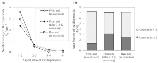 Analysis of the Al-Fe dispersoids’ morphology in Figure 9: (a) histogram of the aspect ratio of the Al-Fe dispersoids and (b) area fraction of the Al-Fe dispersoids classified with the aspect ratio.