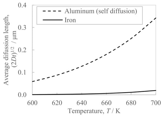 Average diffusion length in the aluminum matrix of the aluminum and iron at 600–700 K for 7 s, where D is the diffusion coefficient, and t is the diffusion time. The parameters for the calculation of the diffusion coefficient D were cited from the reference [].