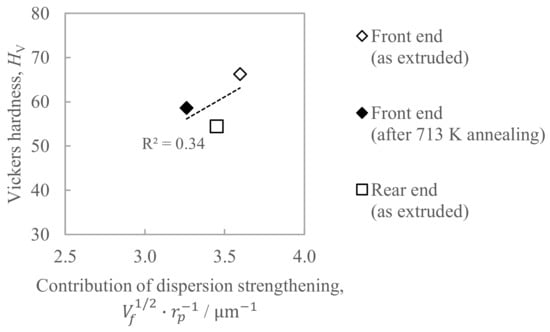 Figure 13 shows the relationship between the hardness and the contribution of dispersion strengthening, where the right sides of Equation (1) was employed as an index. The coefficient of determination R2 in Figure 13 was as small as 0.34, which indicates that dispersion strengthening is not considered to be a controlling factor for hardness.