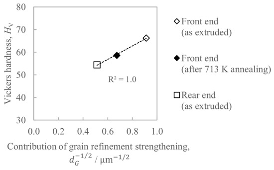 Figure 14 shows the relationship between the hardness and the contribution of grain refinement strengthening, where the right sides of Equation (2) are employed as an index. Since the coefficient of determination R2 in Figure 14 was sufficiently large, with it being as much as 1.0, the determinant of hardness is considered to be grain refinement strengthening. Hence, it is considered that the hardness decrease with the increase in the in situ die temperature is caused by the coarsening of the grain size.