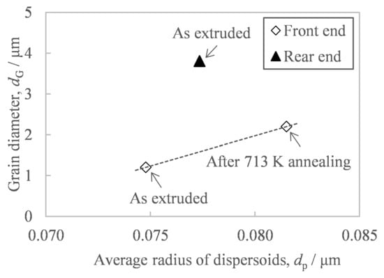 In order to suppress the hardness fluctuation of extrudates, our study has revealed that it is necessary to suppress the coarsening of the grain size due to the temperature increase during extrusion. It is well known that when fine Al-Fe compounds are dispersed, the grain boundaries of the aluminum matrix are pinned by the dispersoids and are therefore hardly move even when exposed to high temperatures of 523–573 K [,]. Since this pinning force depends on the size of the Al-Fe dispersoids, the crystal grain size of the aluminum matrix tends to be proportional to the size of the dispersoids []. However, there are no reports so far on the relationship between grain size and in situ temperature in hot working. Figure 15 shows the relationship between the average radius of Al-Fe dispersoids and the grain size of the aluminum matrix. Comparing the samples at the front end, there is a positive correlation between the grain diameter and the average radius of dispersoids, which is consistent with previous reporting []. However, the grain size at the rear end, where the in situ temperature of hot extrusion increased, was found to be much larger than the trend line for samples at the front end. These results show that an increase in the in situ temperature during hot working made the grain size larger than an increase in the temperature during heat treatment. This difference may be due to the difference in the magnitude of accumulated strain energy, which is the driving force of grain boundary migration. This is because the in situ strain energy accumulated during hot extrusion is greater than the strain energy remaining after extrusion.