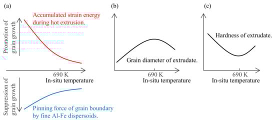 The relationship between hardness and the in situ temperature of the extrusion die followed a curve with a minimum around 690 K (Figure 7a). The assumed material factor is the balance change between the driving force of grain boundary migration and the pinning force. Generally, the higher the hot working temperature of aluminum is above 623 K, the more likely that dynamic recovery occurs and the strain accumulated in the matrix decreases []. On the other hand, it has been confirmed that the higher the in situ extrusion temperature is above 650 K, the more the second-phase particles coarsen and the pinning force of the grain boundary migration decreases (Figure 9). As illustrated in Figure 16, these effects of suppressing grain growth (due to a decrease in accumulated strain energy) and promoting grain growth (due to a decrease in pinning force) might be balanced around 690 K. As a possible experimental method to test this hypothesis, the accumulated strain can be changed while keeping the in situ temperature of extrusion constant and suppressing the size change of the second-phase particles, since not only temperature but also the strain rate affects the amount of accumulated strain in aluminum []. Therefore, in order to clarify the mechanism by which the minimum hardness was around 690 K, a systematic study on the mutual change in extrusion rate and in situ die temperature will be needed in the future.