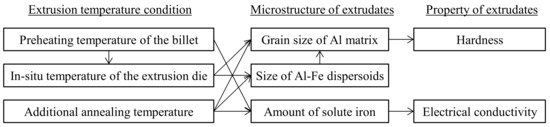 The relationship between the extrusion temperature conditions, microstructures, and properties of the extrudates, as discussed thus far, is summarized in Figure 17. One of the remarkable results of the present study is the clarification of the effect of the in situ temperature of the extrusion die on the hardness of the extrudates. When the in situ temperature rises, the Al-Fe dispersoids and grain of the aluminum matrix become coarse, resulting in a decrease in hardness. As for the electrical conductivity, it was clarified that if the heat treatment time is several minutes or longer, such as with preheating or additional annealing, the amount of solute iron decreases, resulting in the electrical conductivity increasing. These findings are important for the practical application of a rapidly solidified Al-Fe alloy produced by hot extrusion.
