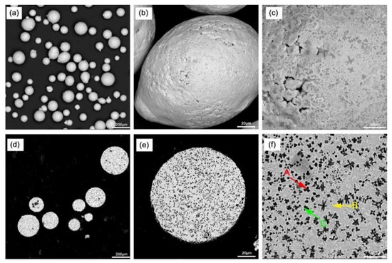 Surface and cross-sectional morphology of the Fe-based powder: (a–c) surface morphology, and (d–f) cross-sectional morphology.