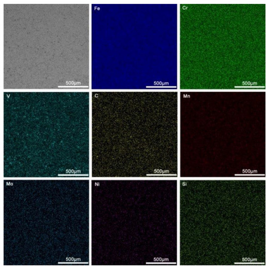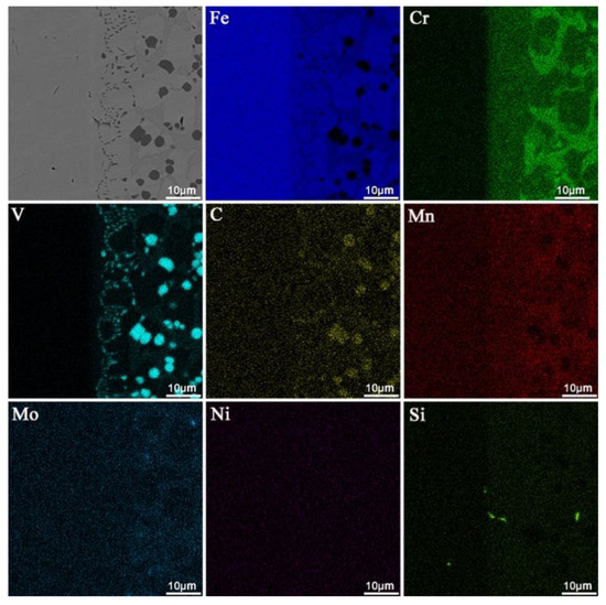 From the line scanning (Figure 10b) and the mapping scanning (Figure 11) results near the fusion zone, it can be seen that elements have mutual diffusion between the substrate and the coating [28], indicating the formation of good metallurgical bonding during the plasma transferred-arc powder surfacing.