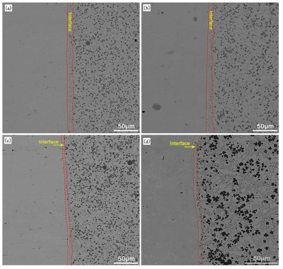 Under the thermal cycling effect of overlay welding, the solid substrate will generate a heat-affected zone. During the surfacing process, the alloy powder is melted into droplets, the reaction time between each element is short, and the reaction degree is intense, resulting in the formation of carbides between carbon elements and other elements in the alloy powder. Due to the convective mass transfer between the raw material powder and the matrix, the microstructure and appropriate binding of the matrix surface will change as the powder gradually cools and solidifies. In SEM images, different organizational structures can be observed from the interior of the surface layer, which is called the interface layer area (as shown by the red boundary in Figure 8). Figure 8 shows the morphology of the fusion zone under different arc currents, and Table 6 shows the width values of the fusion zone interface in Figure 8. Table 6 shows that due to the high pool temperature of PTA powder surfacing, which is conducive to gas release, there are no defects, such as pores and cracks near the fusion zone. Moreover, due to the small heat-affected zone of this process, the width of the fusion zone is relatively narrow. In addition, as the arc current increases, the energy of the plasma arc increases, the melting and penetration ability increases, the cooling and solidification time of the melt pool increases, and the convective mass transport between the substrate and the coating enhances, leading to a gradual increase in the width of the interface.