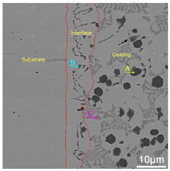 Based on the XRD pattern of the surface coatings in Figure 4, the SEM image of the surface coating in Figure 5c, and the EDS elemental content analysis of the surface coating in Table 5, it can be seen that the surface coating is divided into three regions: spherical black particles (A), dark gray dendritic and inter-dendritic eutectic (B), and light gray, blocky features (C) [24], which are vanadium carbides, eutectic carbides of Cr and Fe, and matrix grains, respectively.