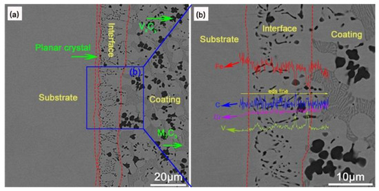 Figure 10 shows the SEM images of the surface layer interface under two different surfacing processes. According to Figure 10a, it can be observed that there are planar crystals in the fusion zone. This is because the latent heat of crystallization released during the solidification of the surfacing powder near the substrate is released through the substrate. At this time, the undercooling of the component is approximately zero, and crystallization occurs under a positive temperature gradient, causing the crystals here to move forward in a nearly planar manner. With the surfacing process, the substrate temperature increases, and the cooling rate decreases. Under the condition of composition supercooling, the latent heat of crystallization can be released through the solid/liquid phase, thus forming columnar crystals (VxCy), dendrites and lamellar eutectic (M7C3).