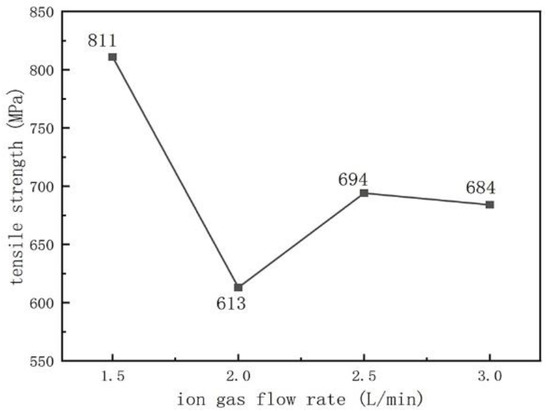 We used tensile strength to characterize the bonding strength between the substrate and the surface layer. Figure 12 and Figure 13 show the tensile strength of the sample after plasma surfacing as a function of the arc current and ion gas flow rate. As shown in Figure 12, as the arc current increases, the tensile strength first increases and then decreases. When the welding current is 120 A, the maximum tensile strength is 694 MPa. From Figure 5, when the welding current increases to 120 A, the content of the VxCy hard phase increases and suppresses grain growth, achieving a dispersion-strengthening effect and the highest strength [28]. When the current increases to 130 A, the excessive hard phase content increases the brittleness and decreases the strength of the weld overlay. As shown in Figure 13, as the ion gas flow rate increases, the tensile strength first decreases and then increases. When the ion gas flow rate was 1.5 L/min, the maximum sample strength was 811 MPa, which may be because the ion gas flow rate at this point matched the protective gas flow rate and the arc current, allowing the arc to reach stability [29]. As the ion gas flow rate increases, the arc stiffness increases, the molten pool temperature formed during plasma surfacing is higher, and the carbide content in the coating increases (as shown in Figure 6), resulting in a decrease in tensile strength.